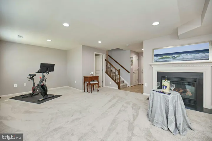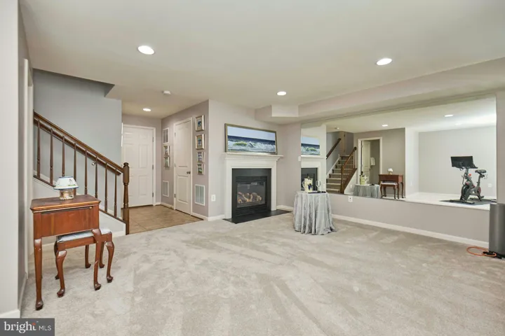 The walkout lower level is filled with natural light from three above-ground windows and includes a gas fireplace with wood mantel, a powder room, and access to the oversized garage with built-in storage space and overhead racks—offering excellent functionality and flexibility.