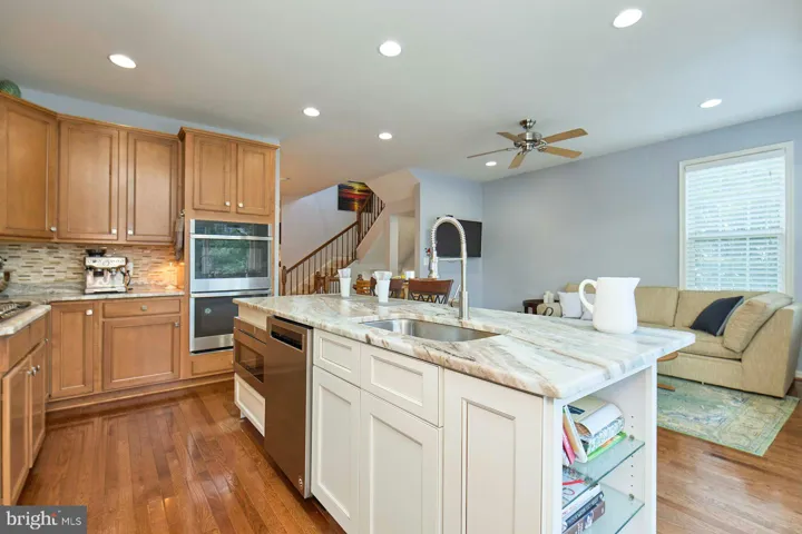 Inside, you’ll love the gourmet kitchen, thoughtfully renovated with a new extended island, leathered granite countertops, ceramic tile backsplash, and upgraded stainless steel appliances, including a Thermador 5-burner downdraft cooktop, double wall ovens, under-counter microwave drawer, and a spacious 4-door refrigerator. The Kitchen updates were completed in 2021.