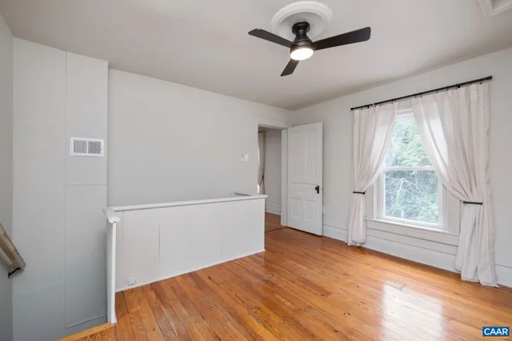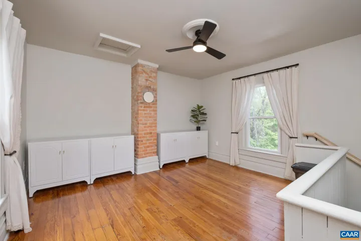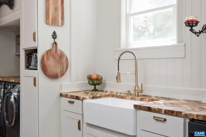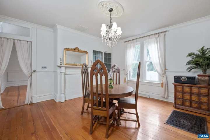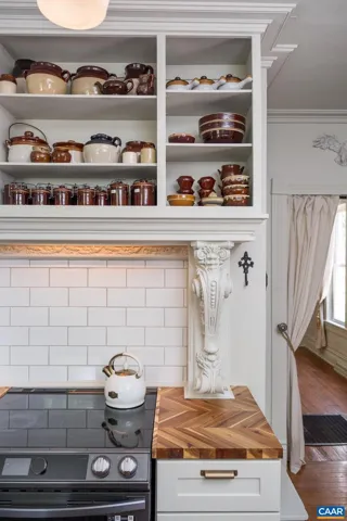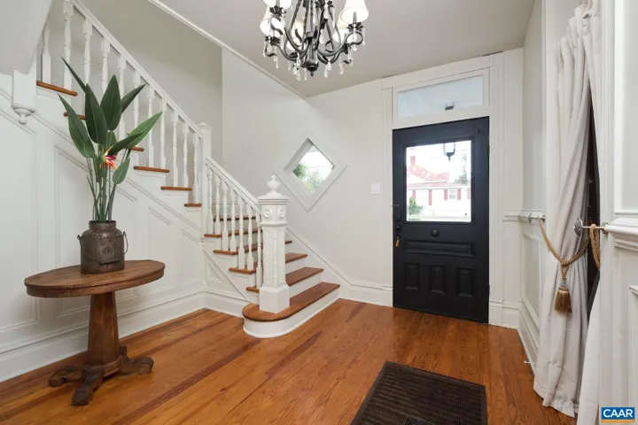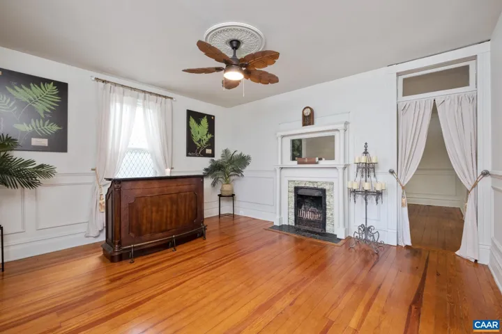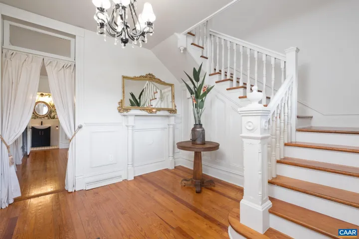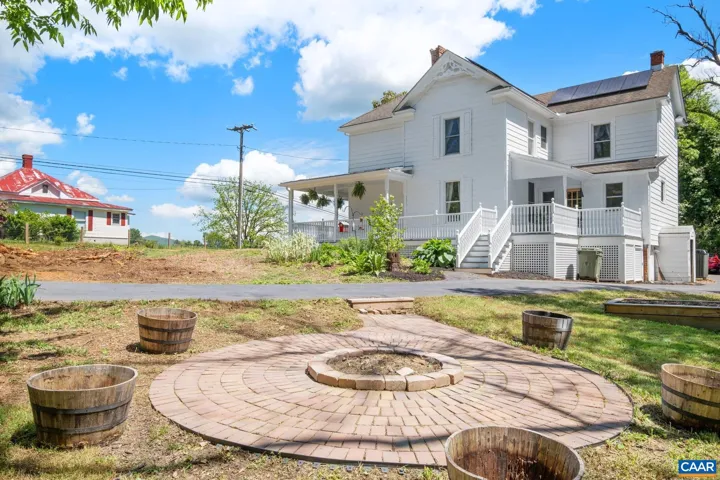 Priced below appraisal – must see to truly appreciate! This fully restored 1917 Queen Anne Victorian, set on 1.59 acres across 2 parcels, offers future development potential with public utilities available. This 4 bedroom, 1.5 bath offers easy an option to add a full second bath and walk-in closet, for a luxurious owners-suite. Enjoy sweeping Blue Ridge Mountain views on the newly constructed wraparound porch to the original hardwood floors and custom millwork throughout, no detail has been overlooked. The custom kitchen evokes an old-world European aesthetic with handcrafted cabinetry and open shelving, while the upstairs primary suite boasts a hidden staircase and bonus flex room?perfect for an office, nursery, or future en-suite bath. Outside, enjoy established walking trails, fruit trees, abundant wildlife, a heritage outbuilding, and a custom brick firepit ideal for year-round gatherings. Recent upgrades include new HVAC, fully renovated kitchen and baths, fresh interior/exterior paint, owned solar panels for incredible energy savings and much more. With its rare architectural details and modern livability, minutes to Downtown, this property is truly a rare find. Schedule your private showing today.,White Cabinets,Fireplace in Living Room