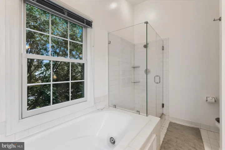 The upper level features an expansive primary suite with cathedral ceilings, hardwood floors, a custom walk-in closet, and a spa-inspired bath with double vanities, soaking tub, and a frameless glass shower. Two additional bedrooms, both with hardwood floors, and a full hall bath with a tub complete the top floor.