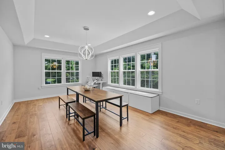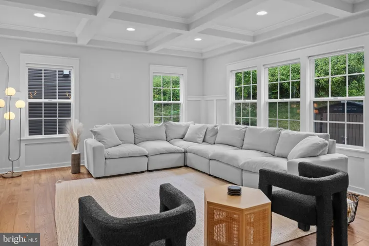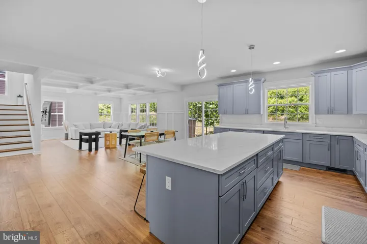From the moment you enter, you’ll be impressed by the open concept layout, modern finishes, and abundant natural light. The main level boasts elegant wood flooring, a spacious living room with coffered ceiling, recessed lighting, and an abundance of windows. The gourmet kitchen is a chef’s dream featuring a large island with pendant lighting and bar seating, quartz countertops, stainless steel appliances, a butler’s pantry boasts an additional sink, and ample cabinet space. A formal dining room and a convenient half bath round out the space, along with a main-level bedroom with a private full bath—ideal for guests or multi-generational living.