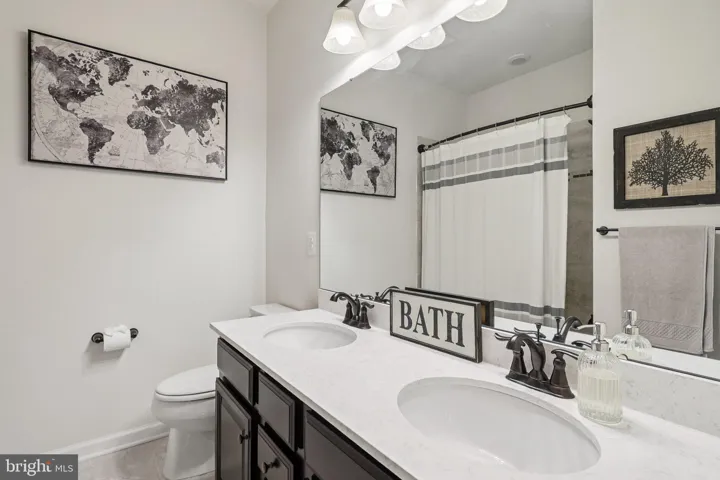 Retreat to the luxurious primary suite, complete with a tray ceiling, cozy sitting area, two walk-in closets, and a spa-inspired bath featuring luxury tile, dual vanities, and a shower with dual shower heads. The upper level offers two additional bedrooms, a beautifully appointed full bath with dual sinks, and a laundry room with built-in cabinetry for added convenience.