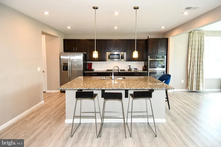 Luxury vinyl plank flooring runs through all the main-level living areas, bringing style and durability. The kitchen is both practical and polished, with granite countertops, espresso cabinetry, stainless steel appliances, a 5-burner gas cooktop, double wall ovens, and a walk-in pantry. The oversized island anchors the space, offering plenty of extra seating and storage. And just off the kitchen, the light-filled sunroom is the perfect spot for morning coffee, casual dining, or a play area that stays within view but out of the way.