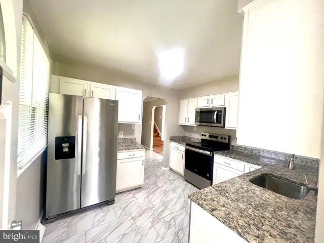 Step inside to find a bright and welcoming kitchen featuring classic white shaker cabinets, Giallo Ornamental granite countertops, and a full suite of brand-new stainless steel Whirlpool appliances, including:
