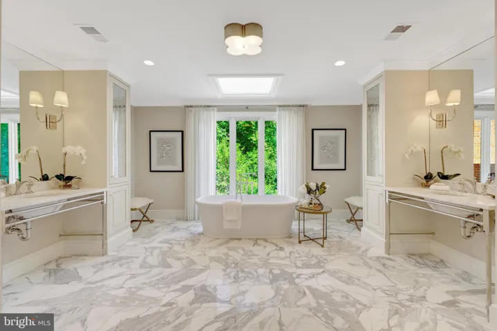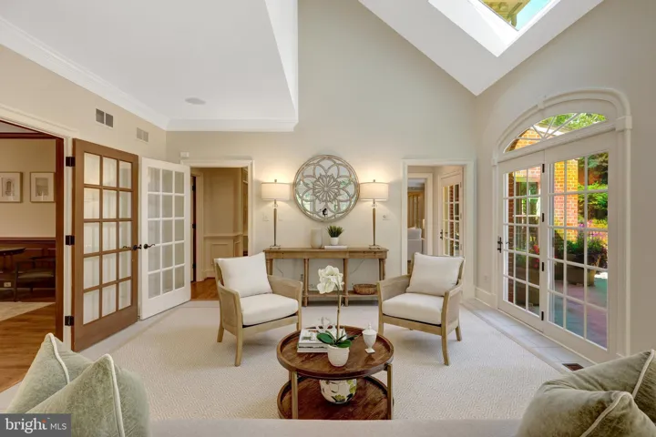 The residence offers a remarkable collection of luxury spaces: a richly appointed office with custom mahogany built-ins, a sun-drenched conservatory, formal living and dining rooms, a private exercise room, guest quarters, and a professionally designed wine cellar with temperature and humidity control. The stunning primary suite serves as a true retreat with cove lighting, a customized walk-in closet, dedicated washer/dryer, and a spa-inspired Carrara marble bath featuring a steam shower and soaking tub.