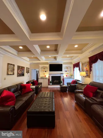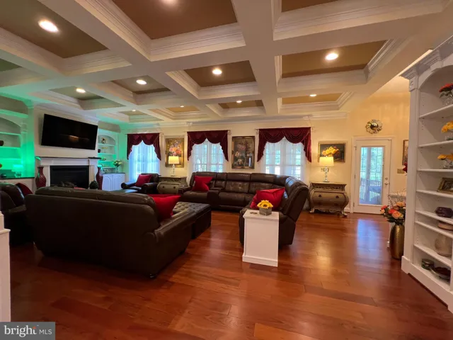 The spacious Great Room features a gas fireplace surrounded by custom bookshelves with marble tops.