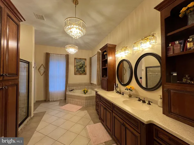 The luxurious Primary Suite offers a private haven, complete with a tranquil sitting area, softly lit tray ceiling, spacious walk-in closet, and a spa-inspired ensuite bath featuring Silestone quartz countertops, bronze fixtures, custom cabinetry, an oversized shower, and a corner soaking tub.