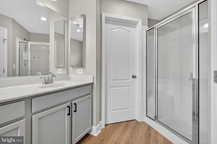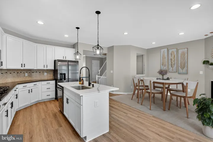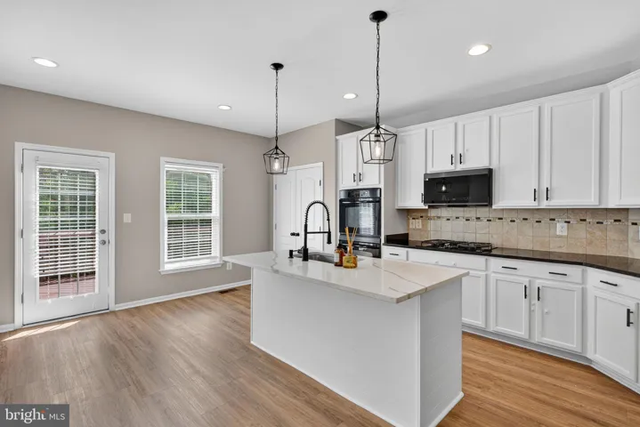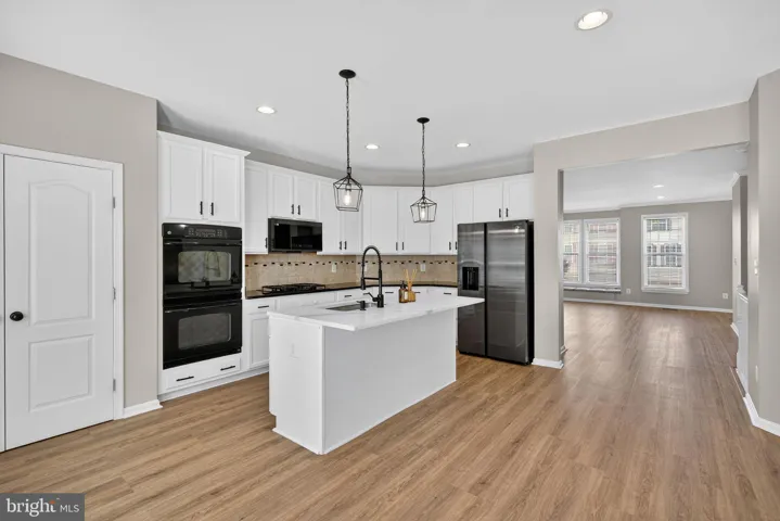 Step inside the main level and be greeted by gleaming LVP flooring, a bright and open dining area, and a spacious eat-in kitchen that’s ideal for both everyday living and entertaining. The kitchen features a large quartz center island, double wall ovens, a refrigerator with icemaker, dishwasher, disposal, and ample cabinet space—all designed with comfort and flow in mind.