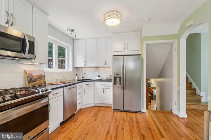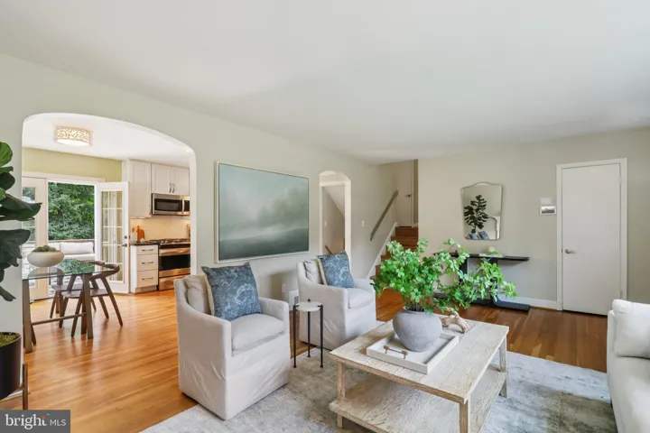 Step inside and immediately feel the inviting warmth of the spacious living room with a wood-burning fireplace, where sunlight cascades through large windows onto rich hardwood floors, creating an atmosphere perfect for both restful moments and lively get-togethers. Elegant arched entryways frame the transitions between living, dining, and kitchen spaces, adding architectural interest while enhancing the home’s open and connected flow. The updated kitchen impresses with modern stainless steel appliances, sleek cabinetry, refined hardwood flooring, convenient storage, and sleek functionality, perfect for culinary enthusiasts and entertaining.