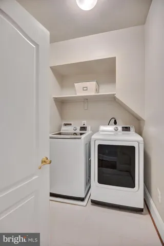 Ascending to the third floor, you’ll find the serene owner’s suite, complete with two custom walk-in closets, ceiling speakers, recessed lighting, Hunter Douglas Top/Down Bottom-Up shades, designer wall-to-wall carpeting, and a luxurious en-suite bath. The spa-inspired bath features a separate water closet, soaking tub, and a walk-in shower with a built-in bench. Two additional well-proportioned bedrooms, a full bath with a glass-paneled shower/tub combination, and a linen closet offer functionality and comfort. A full-sized laundry room with a 2018 washer and dryer is also located on this level for added convenience.