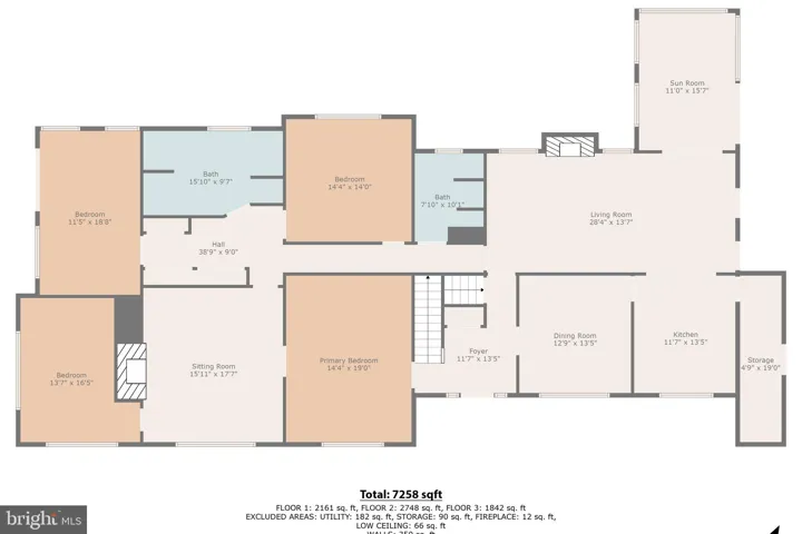 Main Level: 4 bedrooms, 2 full baths, large kitchen, walk-in pantry, dining area w/fireplace, sunroom, office