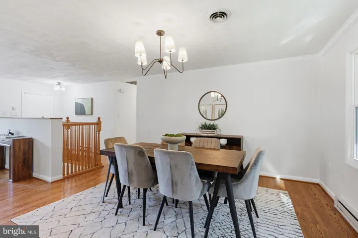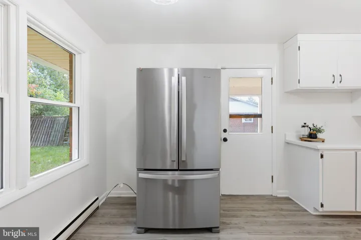 The main level features freshly painted walls (September 2025), original hardwood floors, and abundant natural light. The kitchen boasts original cabinetry freshly repainted this month, newer knobs and hinges (2025), and a 2-year-old refrigerator. The adjacent dining and living areas are perfect for everyday living or entertaining, highlighted by a cozy wood-burning fireplace.
