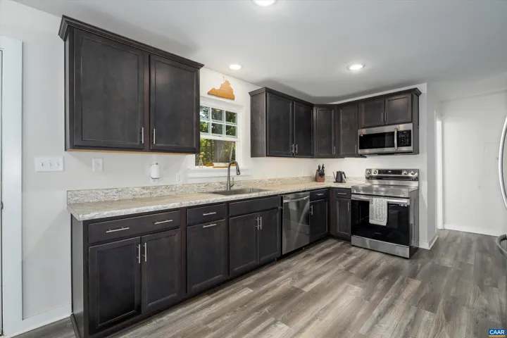 Welcome to your new home at Lake Monticello. This home was built in 2023 and has been extremely well maintained which makes it seem like its brand new. When you walk in, you will feel the warmth of the living room which wraps around into the kitchen. The kitchen has modern appliances and a large work surface. The open feel of the main floor makes entertaining a joy and also provides a cozy space for family dinners together. Once upstairs you’ll find all the bedrooms and just wait until you see the views from the primary bedroom windows. The large windows make you feel like you are waking up in a treehouse. Custom Levolor blinds are installed throughout the home. Downstairs windows are light filtering and upstairs blinds are a mix of blackout and light filtering. The back deck is large enough for a sitting area or grill and the yard opens into a common area which makes it seem larger than most lots at the Lake. A cute garden spot is included and berry bushes are planted throughout the property.,Formica Counter,Wood Cabinets