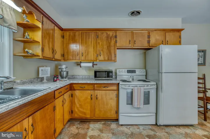 The large eat-in kitchen features solid wood cabinetry, generous counter space, and plenty of room for preparing your favorite meals. A convenient main-level laundry area sits just off the kitchen for added functionality.