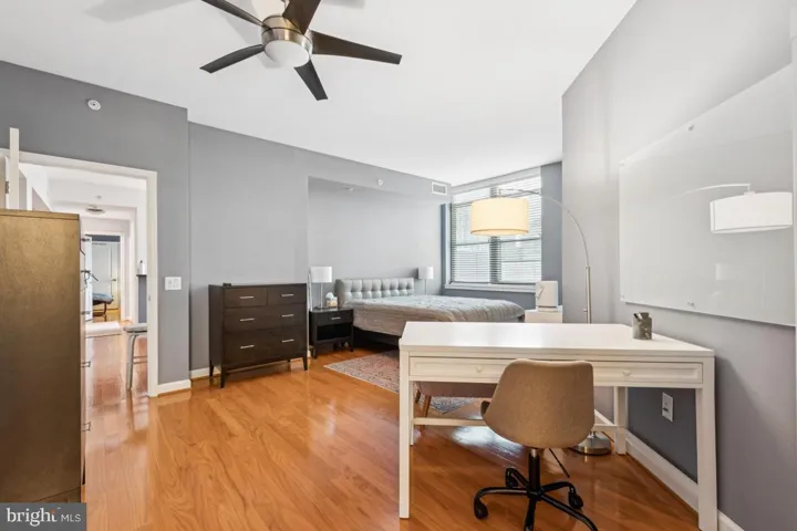 Inside, the residence reflects the same level of refinement. Enjoy, rich hardwood flooring throughout, a wide balcony perfect for morning coffee or evening sunsets, and floor-to-ceiling windows that flood the home with southern light throughout the day. The open and airy custom kitchen is as functional as it is beautiful. The family room and dining room are perfect for gatherings of all sizes! The oversized primary suite offers substantial space for relaxation as well as storage. The large, custom built, primary walk-in closet with shelving is an absolute dream. The very generous secondary bedroom with separate bath offers extra privacy. Ceiling fans with lights in both bedrooms, a Honeywell thermostat and two assigned parking spots in the garage, all add to your daily ease and comfort. The Paramount also excels in community features. Residents enjoy concierge service, a private club room with outdoor space for gatherings, a fitness center and weights room for late-night or early-morning workouts, and an outdoor swimming pool that’s open in season. You’ll also love the peace and quiet of this well-maintained building, known for its thoughtful neighbors and tranquil atmosphere. A rare find in such a central location.