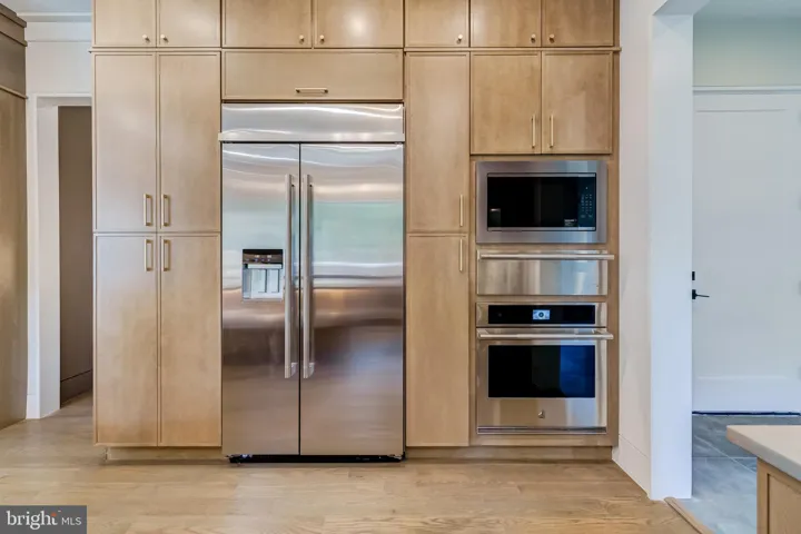 The luxury kitchen exudes refined elegance, featuring floor-to-ceiling custom cabinetry, an oversized island, and soft under-cabinet lighting that sets a moody, sophisticated tone. A sleek wet bar adds an element of effortless entertaining, while the adjacent butler’s pantry provides additional function with elevated style.