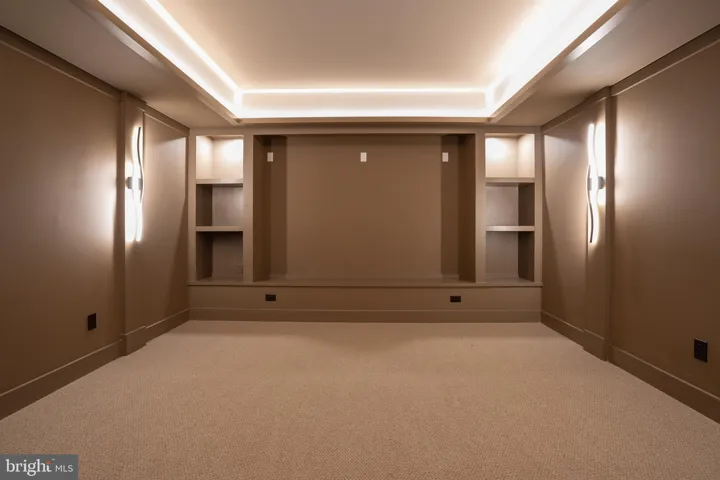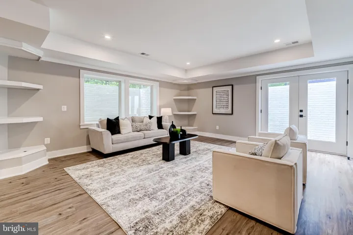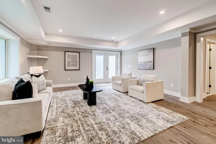 The walkout lower level is an entertainer’s dream, featuring a chic wet bar with seating, a spacious living area, and a media room designed to mimic the feel of a private cinema—all seamlessly flowing to the backyard for indoor-outdoor living.
