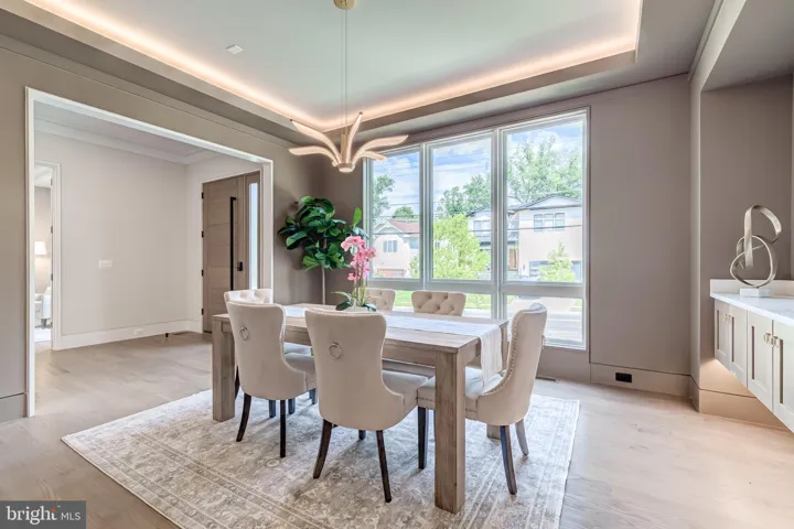Beyond the kitchen, the formal dining room makes a bold statement with its rich, moody hue, sculptural lighting, and built-in buffet—perfect for memorable dinners or festive celebrations.