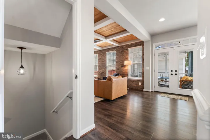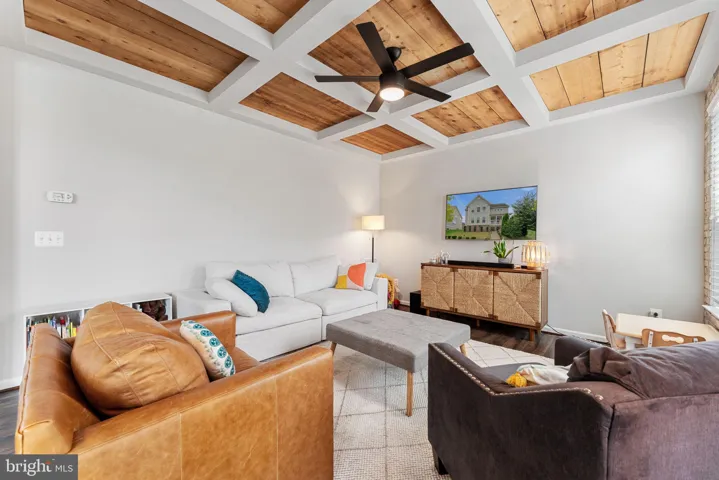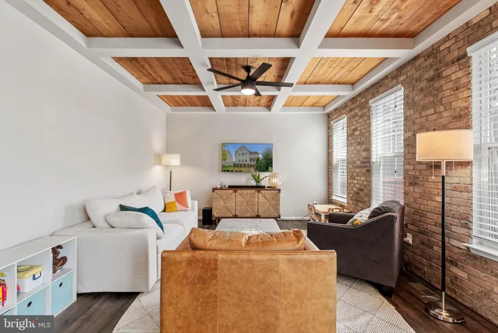 Inside, discover a light-filled, open floor plan that’s perfect for entertaining! Beautiful LVP flooring, wrought iron railing, crown moulding, chair rail are just a few upgrades that you’ll notice throughout the main level. The living room has a stunning coffered ceiling featuring custom wood inset and brick accent wall – a true conversation piece. The open-concept kitchen and dining area flow effortlessly to the newly added screened-in porch finished with Trex decking and vinyl railings – the perfect low maintenance, long lasting addition!