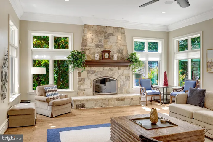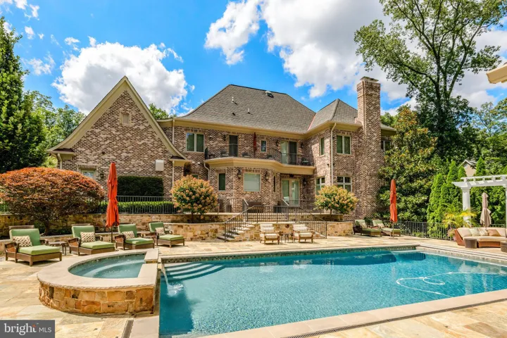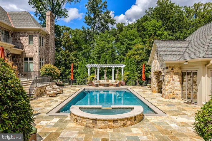 THINK. “SMORES BY THE POOL”!!!!-VERDANT, greenspace (front and rear) surrounds this expertly crafted residence built by Solitaire Homes Nearly 10,000 square foot home on a DOUBLE LOT with 5 bedrooms and 8 full baths and 3 half baths, exhibits stellar workmanship coupled with additional upgrades and enhancements by owner and has a 4 -car side-entry garage and circular driveway. Adding to the finished square footage of the three-level residence, is an exquisitely appointed 2 level “pool house” perfect for expanded entertaining and informal living. Included in the pool house is full bath, great room, flat screen TV and, covered outdoor kitchen with grill, bar height granite counters, undermount ss sink and ceiling fan. Lower level of pool house has washer and dryer, large prep/catering kitchen,separate icemaker and storage space.. The front and rear exterior flaunt professional landscaping with crepe myrtles, boxwoods,.etc. Expansive hardscaping in rear includes inground salt water pool with automatic cover, extensive matching flagstone hardscaping around pool and attractive pergola . Separate “step- up /elevated” area with gas fireplace w/ stone chimney and stone seating wall provide another separate conversation area. Smores have never been so luxurious! This magnificent residence is fully fenced with secure gates for both incoming and outgoing vehicles. THE ENTIRE HOME PLUS POOL HOUSE AND EXTERIOR IS WIRED FOR STEREO/SOUND SYSTEM.