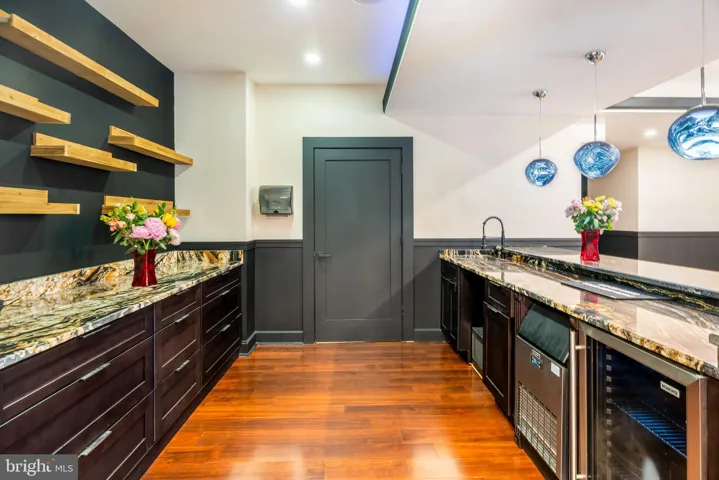 The lower level is where this home truly comes alive—crafted for memorable evenings and lavish entertaining. A moody, black-and-gold granite bar glows under curated lighting and is fully equipped with an ice maker, wine cooler, and space for celebratory toasts. Adjacent, a stylish lounge with a pool table flows into a dedicated theater area with reclining cinema chairs and a massive screen. But the showstopper? A hidden door opens to a private speakeasy-inspired poker and cigar room, complete with full ventilation, built-in humidor, and an additional wine cooler—luxury with a wink.