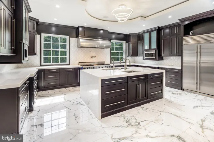 At the heart of the home, the chef’s kitchen is a symphony of style and utility: a built-in espresso machine, 8-burner Viking range with statement hood, SubZero refrigerator, trash compactor, and three sinks anchor an oversized center island, while a custom crystalized marble dining table and bench offer a seamless transition from casual meals to sophisticated hosting. Subtle lighting accents the glowing, opaque marble countertops, and built-in speakers add rhythm to every gathering.