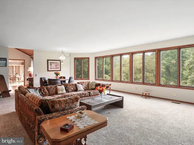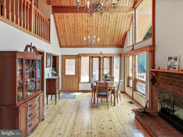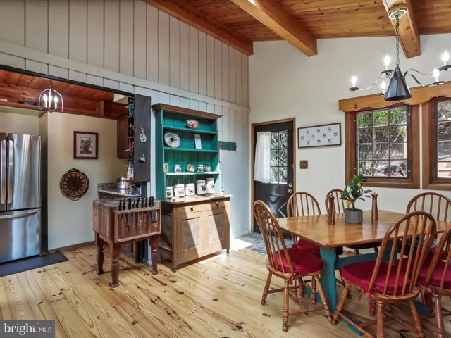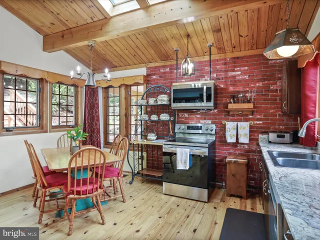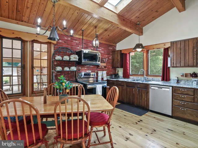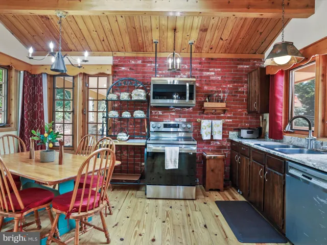 Crafted to embrace its tranquil setting, the home offers over 3,000 square feet of light-filled space, where vaulted ceilings, exposed beams, and generous windows frame uninterrupted views of the Blue Ridge. The kitchen has been renovated with granite countertops, 2023 stainless steel appliances, and tasteful finishes that honor the home’s organic warmth.