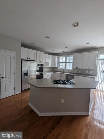 Gourmet kitchen with center island, tile backsplash, stainless steel appliances (including a brand-new double wall oven), and freshly painted cabinetry