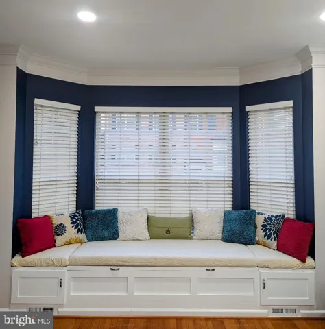 Built-in bench seating with storage in the bay window adds charm and functionality