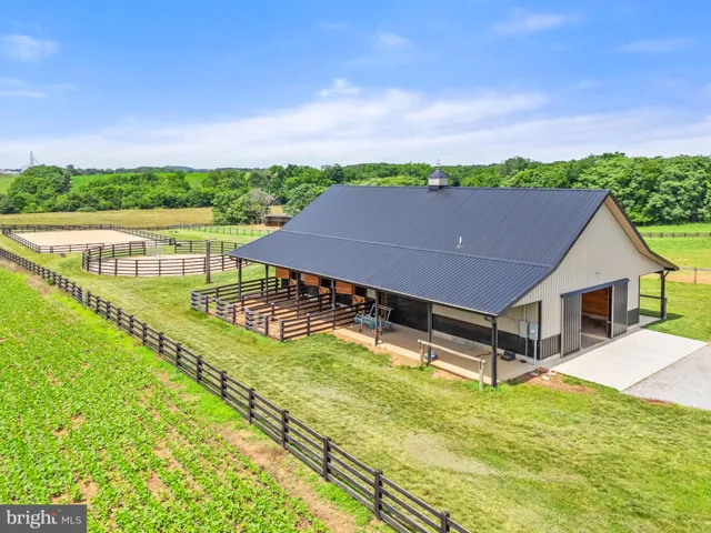 Once a small dairy, now an equestrian’s dream, the 2022-built six-stall barn has a conditioned tack room with half bath, wash stall, and feed room. The arena and round pen, added in 2023, have fiber footing. Eight fenced pastures are ideal for grazing, while larger fields are in crop. Between the house and barn are a playset, in-ground trampoline, chicken coop, and greenhouse.