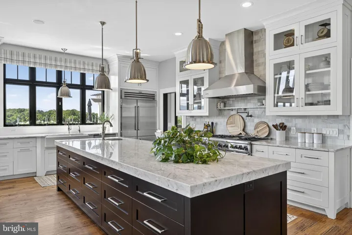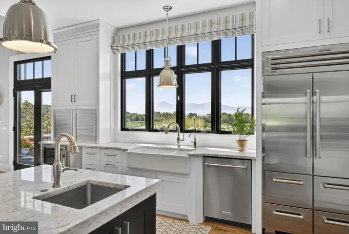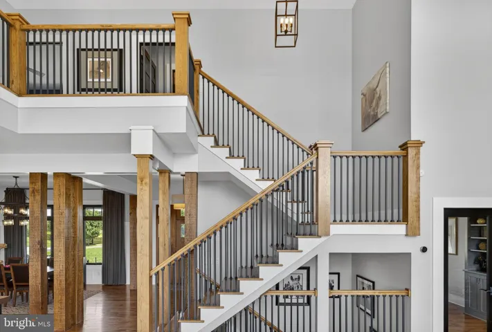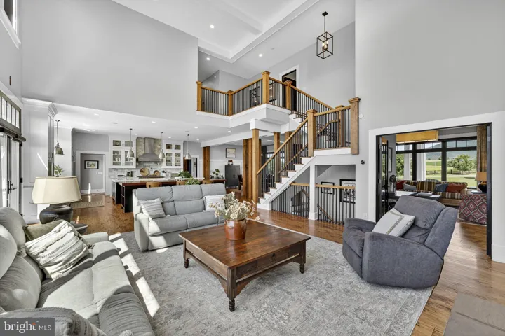 Inviting yet undeniably impressive, the home features hickory wood floors, a floor-to-ceiling stone fireplace, tall wainscoting, and soaring two-story windows that overlook the pool, pastures, and mountains. The chef’s kitchen, with premium finishes and two oversized islands, flows to the dining and great room. The main-level primary suite is large with an indulgent bathroom and custom closet.