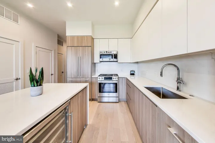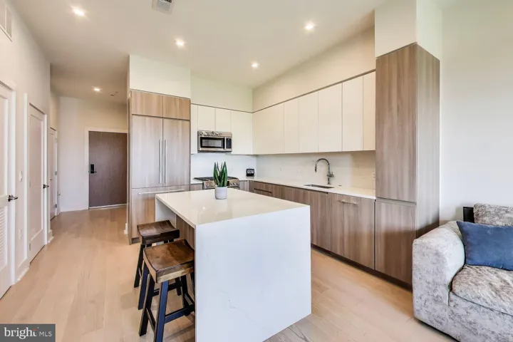 Built in 2023, the unit feels fresh and sophisticated with white oak flooring, stainless steel appliances, a wine fridge, and a sleek modern layout. The spacious kitchen opens to light-filled living and dining areas, while the primary suite features a large walk-in closet and a spa-like bath with a walk-in shower. Every inch of the home reflects careful care and high-quality finishes.