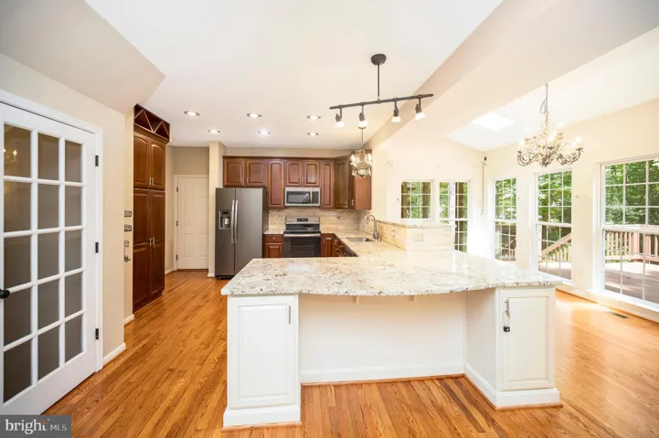 The heart of the home is the chef’s kitchen, featuring granite countertops, stainless steel appliances, and a striking stone-style backsplash. The spacious eat-in area is surrounded by windows, filling the space with natural light. Just off the kitchen, the inviting family room offers a cozy gas fireplace—ideal for relaxing or entertaining.