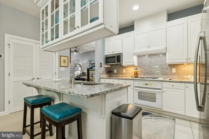 • Updated kitchen with 42” cabinets, granite countertops (2025), gas cooktop, wall oven, tile flooring, and a center island with built-in sink