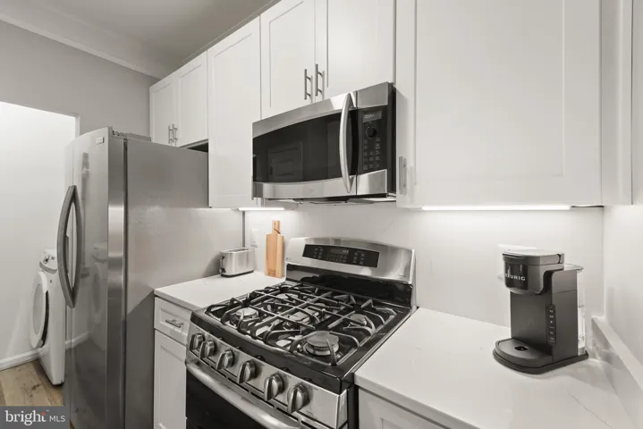 Step into the open-concept kitchen with timeless white shaker cabinets, quartz countertops, and newer stainless steel appliances. Gorgeous luxury vinyl plank flooring, updated lighting and ceiling fans, and crown molding add upscale touches throughout. The oversized bathroom boasts a double vanity, garden soaking tub, and plenty of space.