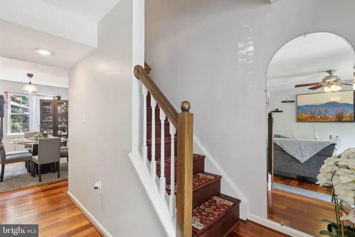 The main level features a bright living room with lovely Brazilian Cherry hardwood floors, a cozy fireplace and a large eat-in kitchen with abundant cabinet storage and generous table space—perfect for casual meals and everyday living. Step outside from the kitchen to a large rear deck overlooking the fenced backyard, ideal for relaxing or entertaining. A convenient half bath completes this level.