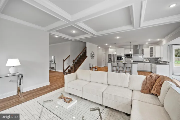 The main level boasts a spacious open-concept design with dramatic coffered ceilings, a striking stacked stone fireplace, and wide-plank flooring. A first floor guest room and full bath flexibility for visitors or multigenerational needs.
