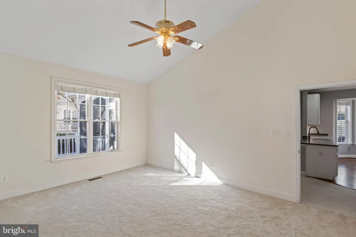 Inside, the main level dazzles with gleaming hardwood floors, premium carpeting, fresh neutral paint, and crisp white trim. Architectural details—crown molding, chair rail, and floor-to-ceiling columns—elevate the sun-filled living room. The formal dining room, illuminated by a chic chandelier, flows effortlessly into the gourmet kitchen, which features a center island, Corian countertops, stainless steel appliances, and a cozy breakfast nook. The airy family room, with its vaulted ceilings, ceiling fan, and generous wall space, opens directly to the oversized deck and beautifully landscaped backyard complete with an in-ground irrigation system—a perfect spot for quiet outdoor gatherings.