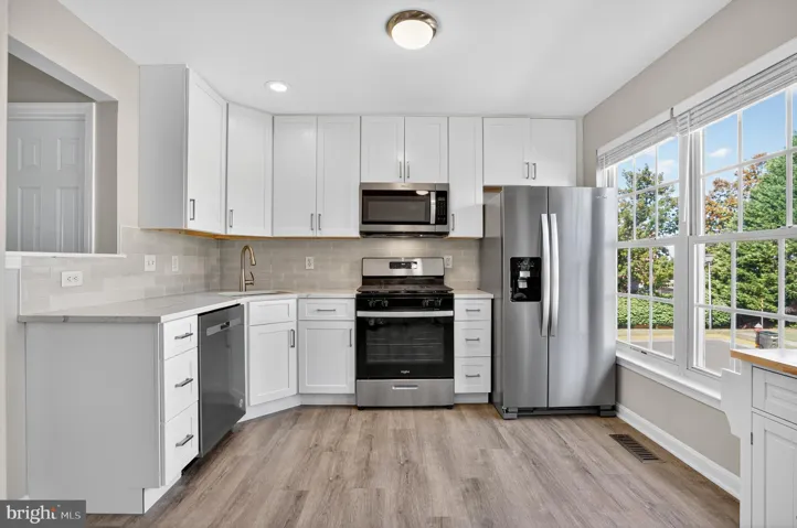 Welcome to this stunning 3-bed, 2.5 bath end-unit townhome within the sought-after Trailside community in Sterling. Combining modern style with everyday comfort, this home offers a peaceful retreat with low HOA fees and a prime location. The main level provides a welcoming space to entertain or unwind, featuring ample natural lighting and luxury plank flooring throughout. The beautifully updated kitchen boasts white shaker-style cabinetry, quartz countertops, a classic subway tile backsplash, stainless steel appliances, and an adjoining dining area. Cozy up near the gas fireplace in the spacious family room that opens to a newly painted deck (2025) complete with a built-in bench, ideal for everyday enjoyment. A stylish and fully updated powder room is conveniently located on this level. Upstairs, two generous bedrooms shared a spa-inspired bathroom with a glass-enclosed shower, dual vanity, and jacuzzi-style soaking tub. The primary suite is enhanced with vaulted ceilings and excellent wardrobe space. The lower level adds versatility with a third bedroom offering direct rear yard access, a full bath, and a laundry room—perfect as a guest suite, in-home office, or additional living space. Outdoors, the large fenced yard provides space for everyone to enjoy, while the stone-paved patio is great for relaxed gatherings. Parking is effortless with an attached one-car garage, driveway space, and additional visitor passes. Recent updates include roof (2024), water heater (2023), HVAC (2017), staircase handrail stained (2025), updated showerheads in both bathrooms (2023), and recessed lighting with dimmers in secondary bedrooms (2023). Backing onto the W&OD Trail, this home enjoys an excellent location just minutes from major commuting routes and local amenities, including Wegmans, Target, Claude Moore Recreation Centre and Park, Innovation Center Metro, and Dulles Airport.