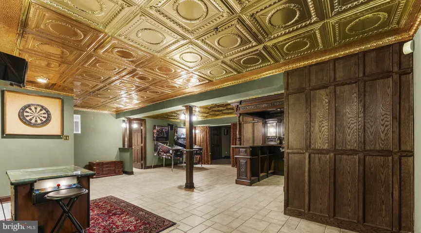 A tavern-inspired space with a pressed tin ceiling and bar—ideal for gatherings and game nights surprises in the lower level. A wine room, home theater, spacious office, and coded safe room are also on this level.