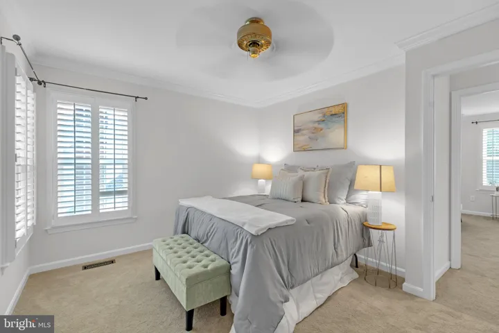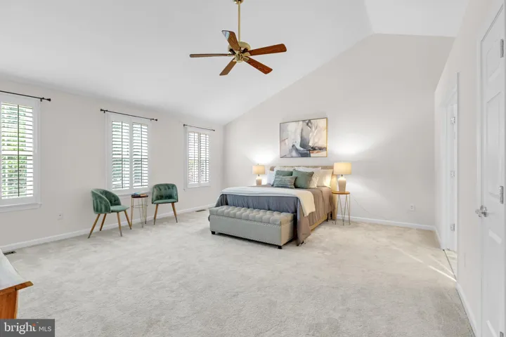 The expansive primary suite features double-door entry, vaulted ceilings, and plantation shutters on three oversized windows. Enjoy a spa-like bath with granite-topped double vanity, make-up area, Jacuzzi soaking tub with jets, separate shower, and two walk-in closets.