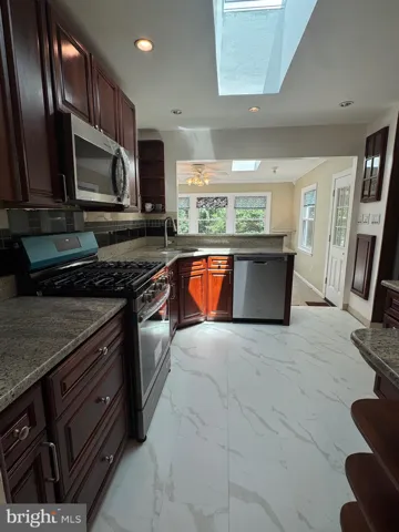 The heart of the home is the remodeled, custom-designed large kitchen featuring granite countertops, tall cabinets, pantry/utility cabinets, a kitchen island with breakfast bar, two skylights, and new appliances. The kitchen opens to the dining room/sunroom extension, creating a bright, open space perfect for cooking, entertaining, and family gatherings.