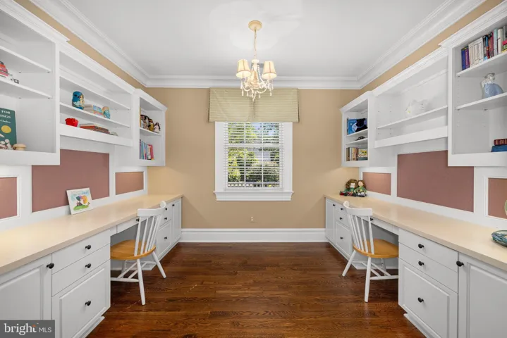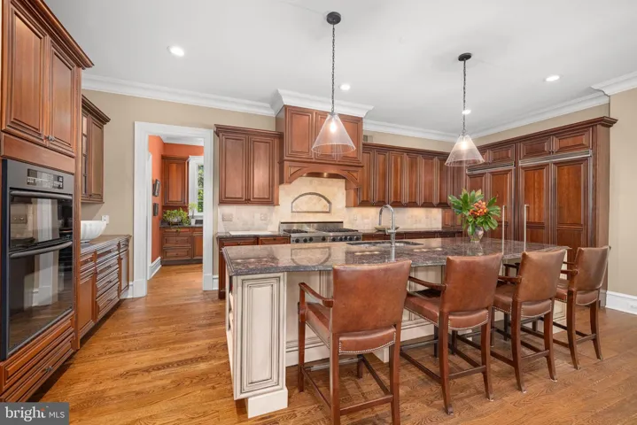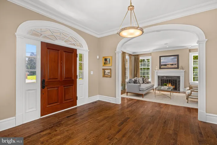 Inside, timeless architecture and bespoke finishes create an elegant yet welcoming ambiance, with a seamless flow between indoor and outdoor spaces. The grand foyer opens to light-filled interiors with 10-foot ceilings and gracious formal rooms: a living room with marble fireplace, a banquet-sized dining room with butler’s pantry, and a richly appointed library with custom built-ins and hidden bar. The family room, anchored by a large stone fireplace, connects to the chef’s kitchen outfitted with professional-grade appliances, a walk-in pantry, and a secondary butler’s pantry with wet bar. The breakfast room, framed by walls of windows overlooking the grounds, features a coffered ceiling and serene vistas. A screened porch with skylights, mudroom, and three-car garage complete the main level.