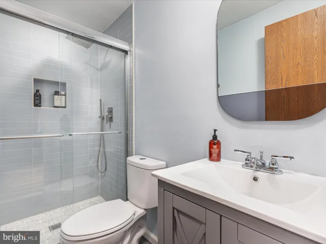 The upper unit features three spacious bedrooms and two and a half baths, all of which have been thoughtfully remodeled with a designer’s touch. From bold, patterned tile floors and modern vanities to matte black and brass fixtures, each bathroom has its own personality while maintaining a cohesive, high-end aesthetic. One standout includes a sleek walk-in shower with frameless glass doors, a rainfall showerhead, and built-in niche shelving—bringing a true spa-like experience into your everyday routine.