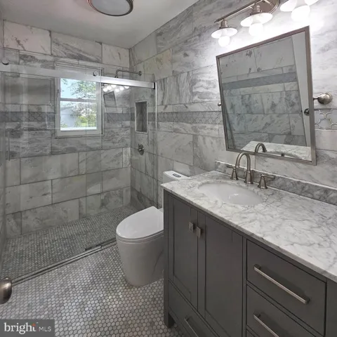 This beautifully renovated home is in excellent shape and situated on a tranquil lot in the convenient Falls Church area- Complete Lawn Care Included for $150 a month- The entry level has been recently improved to include a brand new “Bonus Room,” currently being used as the main bedroom. You’ll love the bright kitchen featuring a cathedral ceiling, skylights, and recessed lighting. It comes with new LG stainless steel appliances, granite countertops, and chic tile flooring. From the kitchen, you can step out onto the fully updated deck and enjoy the spacious, private yard. The main level, freshly painted, comprises a roomy living area with a fireplace, a dining room with a built-in china cabinet, three bedrooms, and a stunning marble bathroom. This bathroom highlights a walk-in shower decorated with elegant gray and white tiles, featuring a toiletries niche, a modern vanity, and decorative wainscoting. There’s an additional updated full bathroom on the lower level, as well as a large recreation room with a fireplace that could serve as another bedroom if needed. You’ll be delighted to find plenty of storage in the laundry/utility room (which has a near-new GE Profile washer and dryer) and the newly added outdoor shed. This truly is a fantastic place to call home.