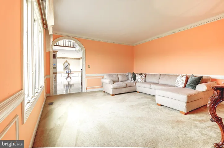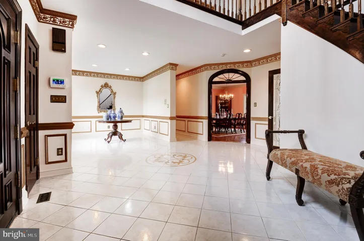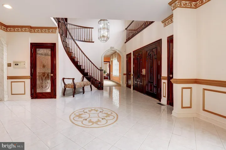 Inside, a grand two-story foyer welcomes guests with marble floors, a sweeping circular staircase, and a gracious keeping/overflow area perfect for greeting visitors or allowing guests to linger at the end of an evening. The main floor showcases intricate moldings, including dental and ornate details, highlighting the craftsmanship throughout.