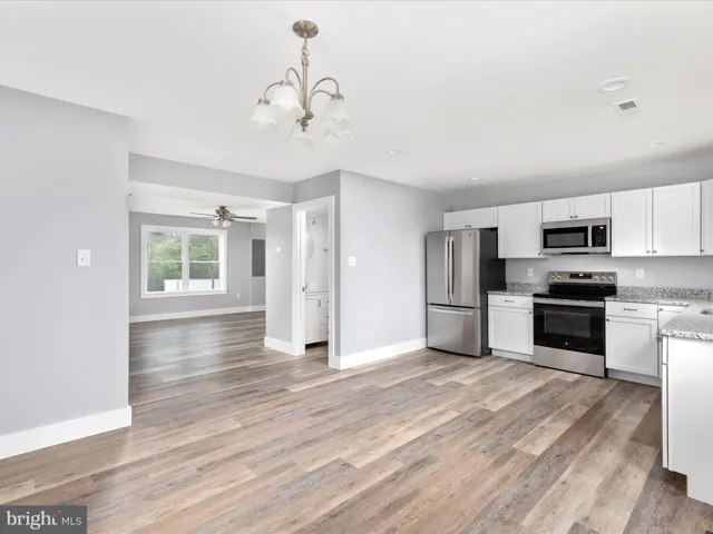 Step inside to an open floor plan featuring a spacious living room and a kitchen/dining combo perfect for entertaining. The kitchen shines with white cabinetry, granite countertops, under-cabinet lighting, and stainless steel appliances—including a refrigerator with water/ice maker, self-cleaning oven, built-in microwave, dishwasher, garbage disposal, and pullout faucet.