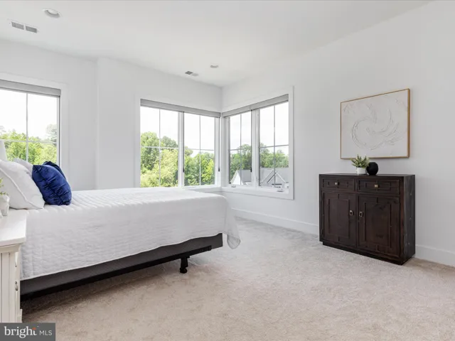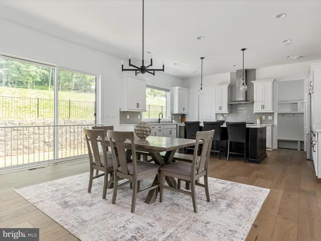 The gourmet kitchen is a chef’s dream—complete with top of the line Bosch and Thermador appliances, crisp white cabinetry with soft close feature, an oversized island with quartz countertops and barstool seating, a modern backsplash, and a large picture window above the sink that floods the space with natural light. Adjacent to the kitchen, the breakfast room offers a comfortable and casual space for daily meals.