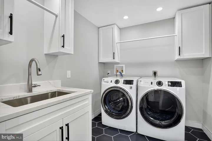 The gourmet eat-in kitchen is a showpiece, outfitted with GE Café series appliances, quartz countertops, and custom slow-close cabinetry—a space designed to inspire culinary creativity. The thoughtfully designed mudroom, accessible from both the yard and garage, includes a full-sized washer/dryer and a second refrigerator.