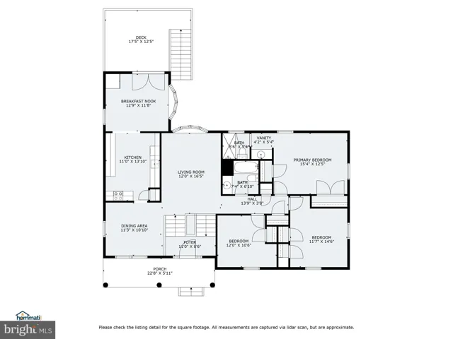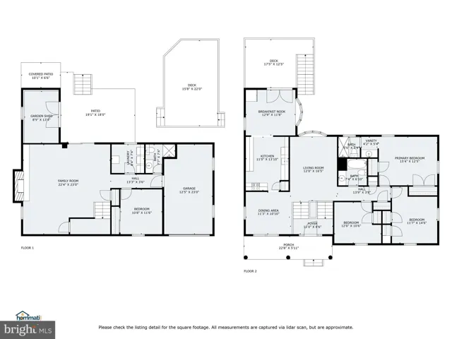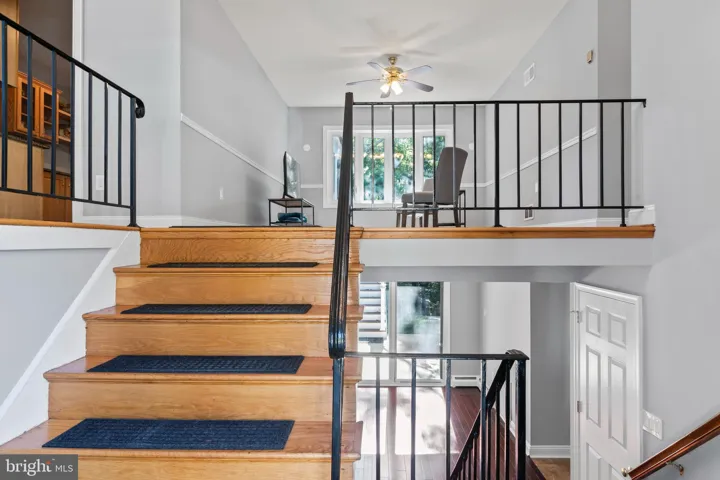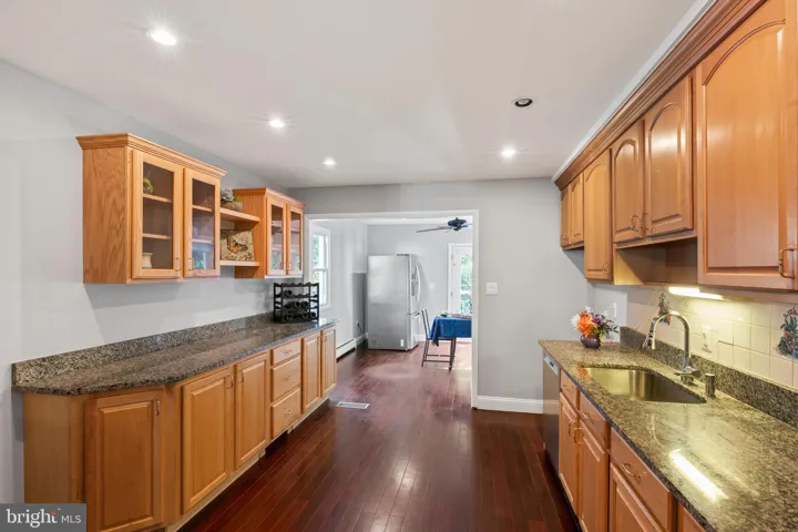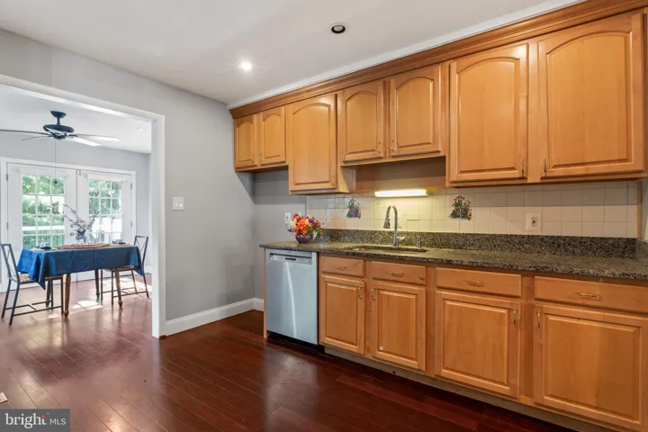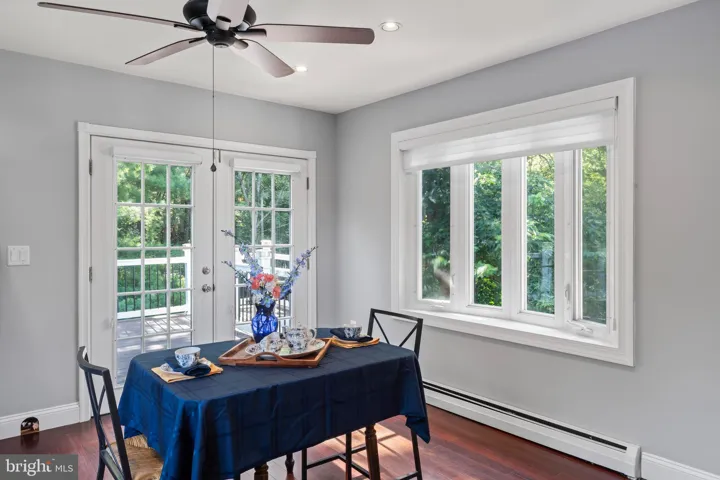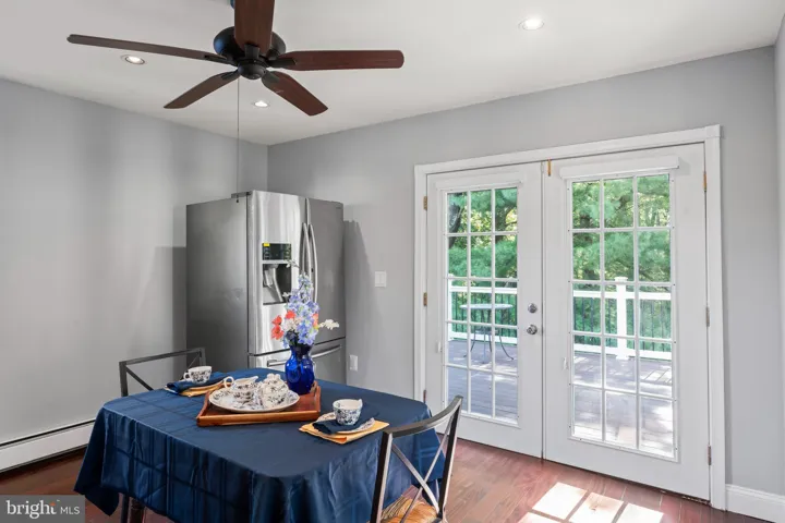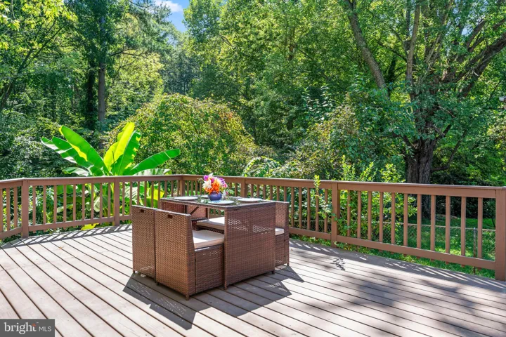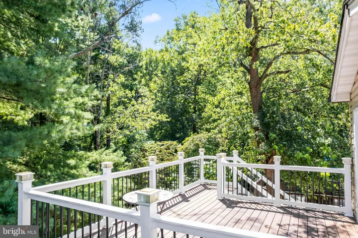 The kitchen is complemented by ample cabinetry, granite countertops, stainless steel appliances, and hardwood flooring. A bright breakfast room with bay windows opens to the upper-level deck—perfect for dining or entertaining.